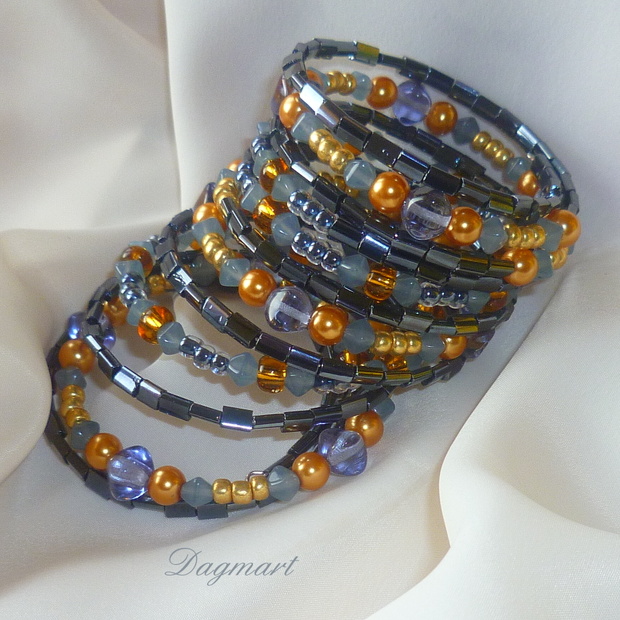 Použity jsou perličky, mačkané korálky a různé druhy rokajlu.