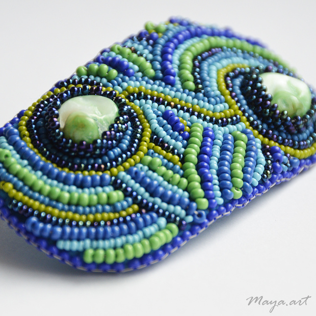 Spona do vlasů je vyhotovena technikou korálkové výšivky z odstínů modrého a zeleného rokajlu různých velikostí. Spona je vyšita na plsť a doplněna o kovovou sponu do vlasů.
