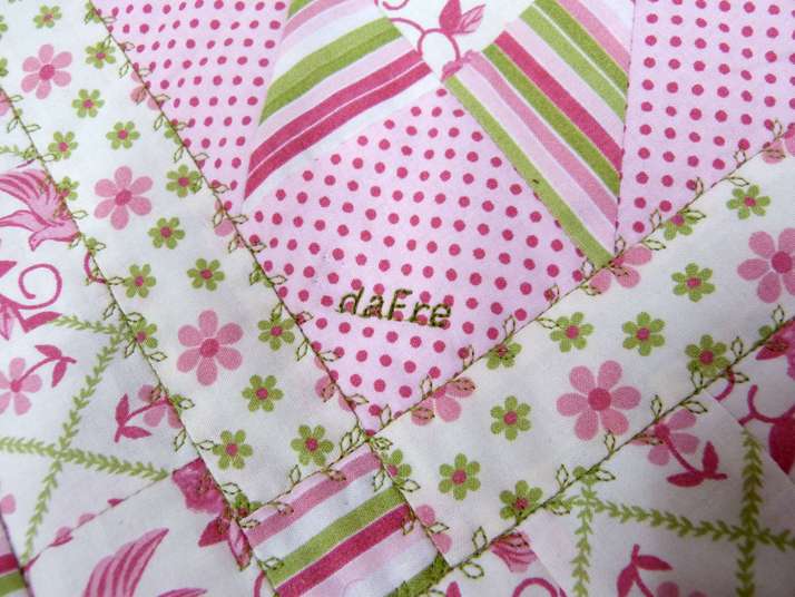 Růžovo-zelená dětská zavinovačka/dečka šitá technikou patchwork pro malou Gitušku - detail