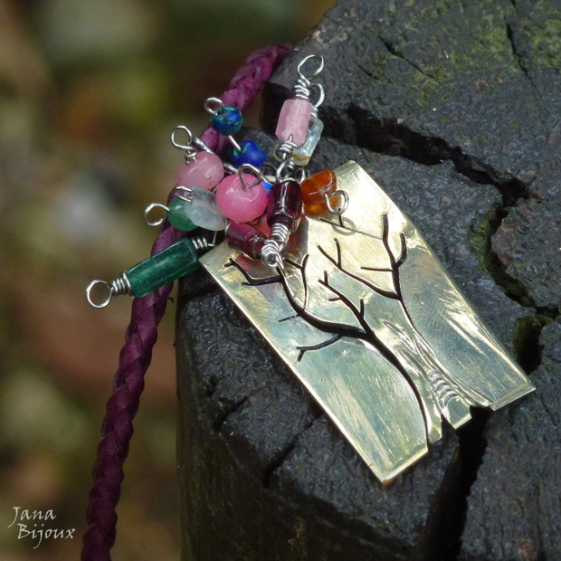 Přívěšek z dílny Dansala z alpaky, kameny na něm na nerez drátech točených v ruce a kůže.