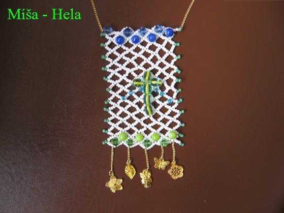 šitý šperk, základem je mřížka a na ni vyšitý kříž a řady větších korálků