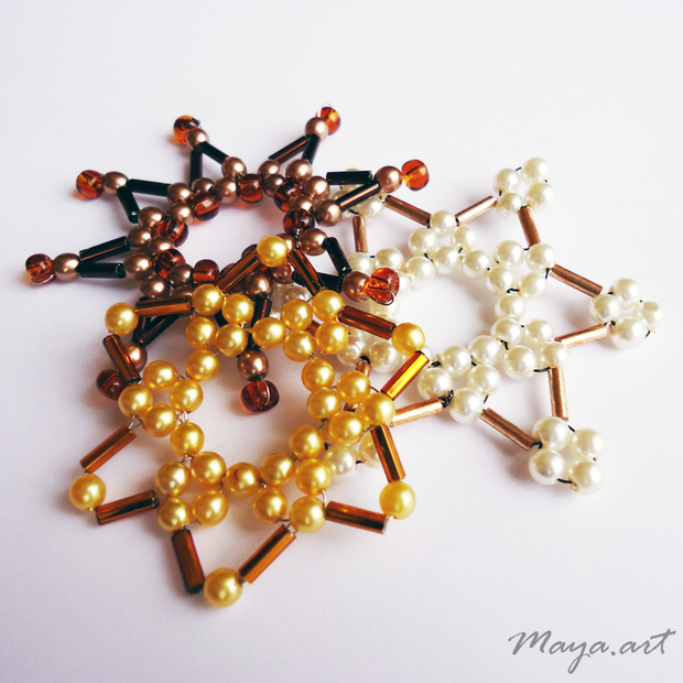 Vánoční ozdoby na stromeček v podobě hvězdiček jsou vytvořeny z drátku a korálků.