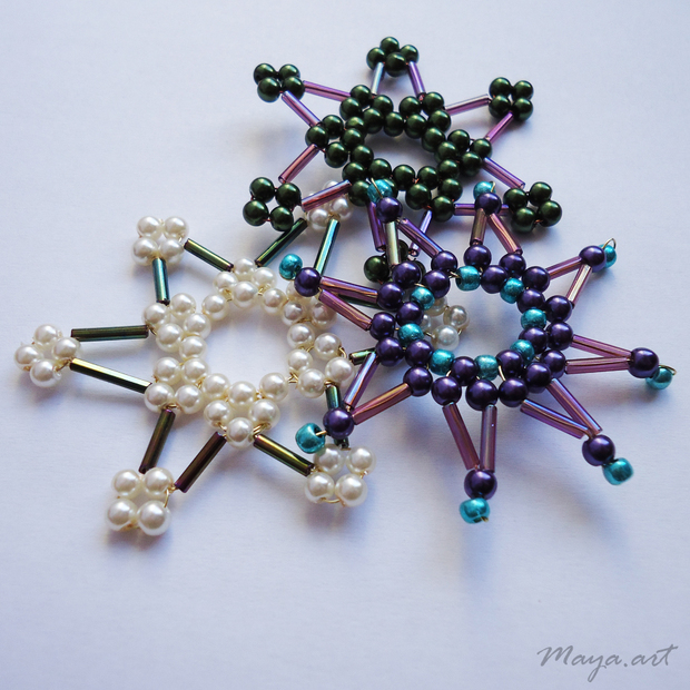 Vánoční ozdoby na stromeček v podobě hvězdiček jsou vytvořeny z drátku a korálků.