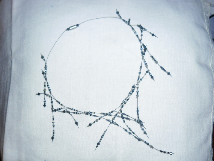 Náhrdelník vyrobený z rokailu černé a průhledné barvy,dále vložené sluníčka také černé barvy navléknuté na lanku a upevněné zamačkávacím rocailem.Magnetickézapínání