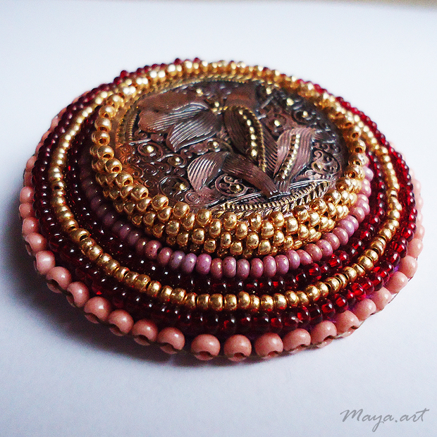 Brož je vytvořena technikou korálkové výšivky. Šperk tvoří okrasný knoflík růžovo-zlaté barvy, který je obšit rokajlem podobných barev na plsť.