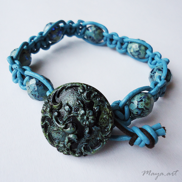 Autorský náramek vyrobený technikou drhání z modrých kožených šňůr a skleněných korálků. Náramek je doplněn o okrasný knoflík, který slouží zároveň k zapínání náramku.