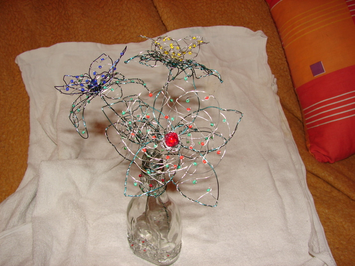 Drátkované květiny, cca 20cm, průměr květu 7cm, cena jedné květiny 115,- Kč, vázička : 100,- Kč