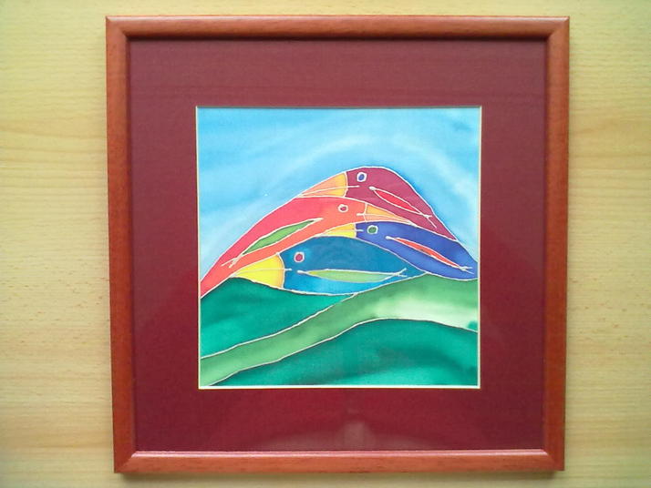 malba na hedvábí, dřevěný rámeček, sklo, 30x30