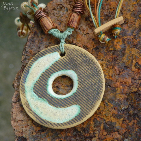 Keramika,zamotance z mědi, semínka, dřevěné korálky a makramé