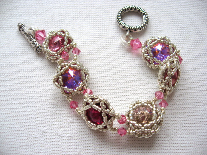 Swarovski rivoli 14mm, Swarovski bicone 4mm a 6mm, Miyuki Delica, TOHO11, OT zapínání, C-lon