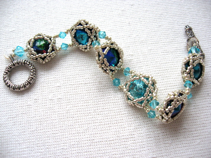 Swarovski rivoli 14mm, Swarovski bicone 4mm a 6mm, Miyuki Delica, TOHO11, OT zapínání, C-lon