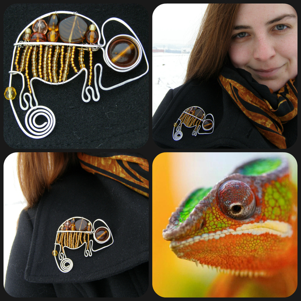 Chameleon je vyroben z části tepaného nerezového drátu o průměru 1mm a vypleten nerezovým drátkem o průměru 0,3 mm. Všechny korálky jsou od českých sklářů. Na rubové straně chameleona je spínací špendlík, který je důmyslně skryt pod středovým tepaným drátkem.