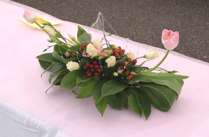 Z živých květin, připomínající lodičku. Svatba proběhla na jaře, proto tulipány.