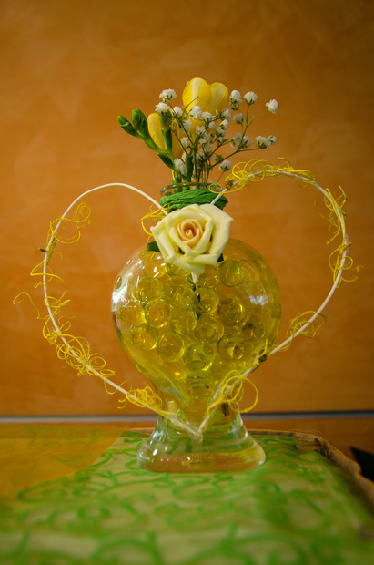 Váza srdce. Proutí, moss, papírová růžička, gelové zelené kuličky a uvnitř živé květy.
