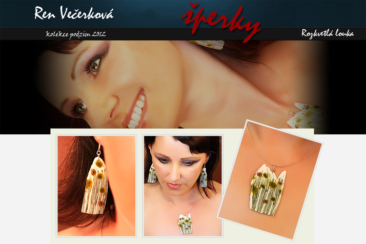 Náušnice a náhrdelník, provedení: atypické tvary s motivem rozkvetlé louky, velikost náušnic 53 mm, náhrdelník 55 mm, délka náhrdelníku 38,5 cm, materiál fimo a krystal reisin, komponenty bižu.