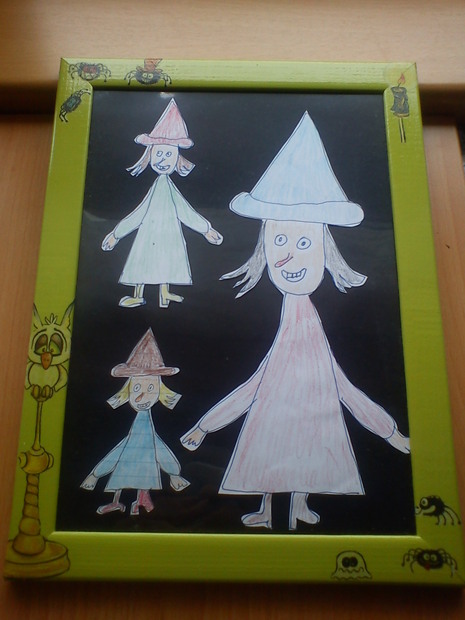 Babička namalovala čarodějnice a Daniel vybarvil a vystřihl a mě se to tak líbilo že jsem jim to dozdobila rámečkem.