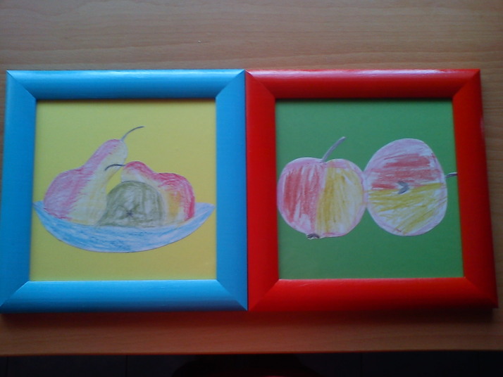 Výtvory ze školky vystřihla jsem jablíčka a hrušky a jasné barvy papíru i rámečků a hned to vypadá skvěle.