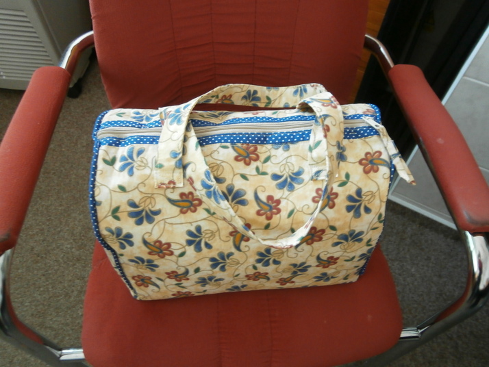 Kabelka s vyztužením, s několika kapsami, uvnitř modrá puntíkovaná podšívka, barevné dno a olemované kapsičky pro lepší přehlednost.