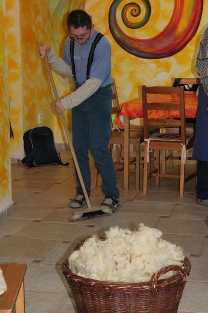 Po cupování vlny, uklízíme po sobě odhozené nečistoty z vlny. Každý se v zametání vystřídá :)