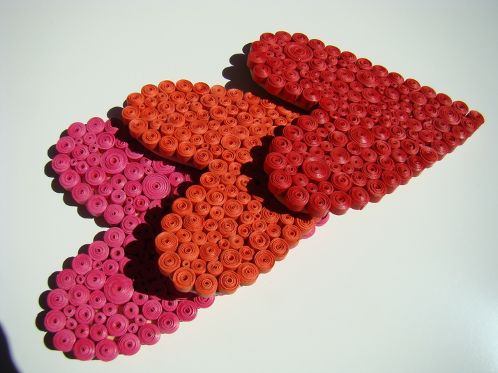 Srdíčka jsou vytvořena technikou quilling,přilepena na vyřezané překližce.