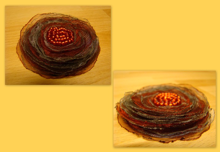 Brož "Carmen" o průměru 7cm,vyrobena z lehké barevné organzy,prošitá červeným rokajlem.Na zadní části přišitý brožový můstek,přelepený filcem v barvě brože.Použití je velmi široké..na Vaši oblíbenou tašku či kabelku,klopu saka,košili,sukni,svetřík,či připnuté na závěsy,záclony,nebo naprosto originálně a nevtíravě rozházené cik cak na Vašem rozkvetlém svatebním stole! :)