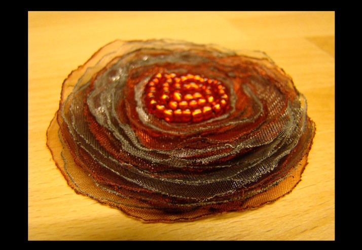 Brož vyrobena z barevné organzy,prošito červeným rokajlem.Průměr brože je 7cm.Ze zadní části je přišitý brožový můstek,přelepený filcem v barvě organzy.Použití je různorodé..připnout kam jen si přejete a kde Vás napadne :) TIP: (připnout se dají nejen na klopu saka,Vaši oblíbenou tašku či kabelku,sukýnku,košili či svetřík,ale i na závěsech,záclonách či rozházené cik cak na svatebních stolech, vypadají kytičky naprosto originálně! :O)
