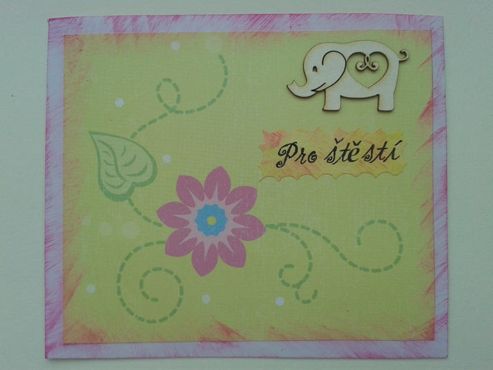 Přáníčko jsem vytvořila ze čtvrtky, barevného papíru s potiskem a dozdobila výsekem od wycinanky, dobarvila razítkovacím polštářkem.