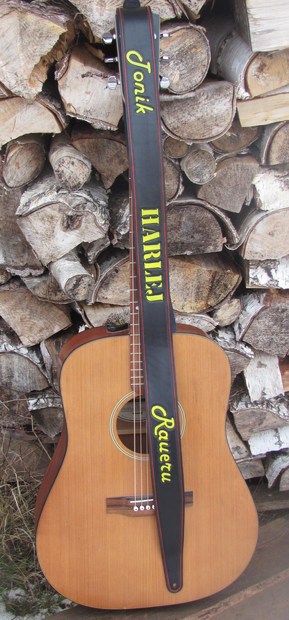 Popruh na elektrickou kytaru.Nápisy a typ písma jsou na přání zákazníka.Barvy jdou k sobě.