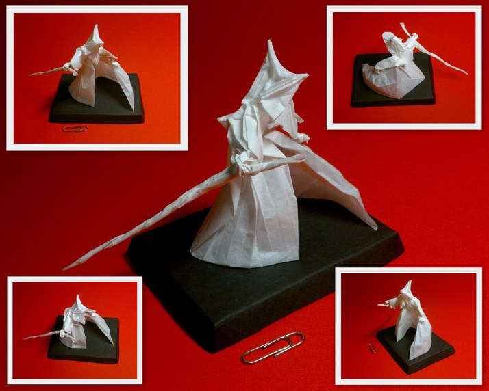 Čaroděj je poskládaný z bílého hedvábného papíru bez stříhání či lepení. Soška je vysoká 82 mm a podstaveček má rozměry 70 x 100 mm.
