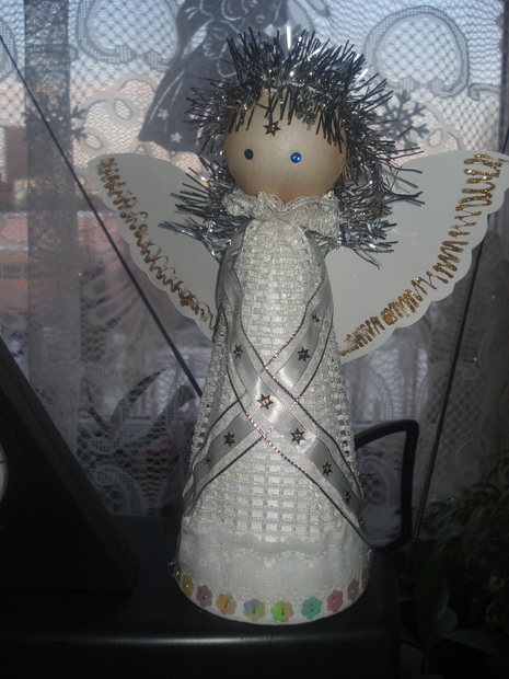 Základem je polystyrenový kužel a koule. Andělíček je vysoký 35 cm.