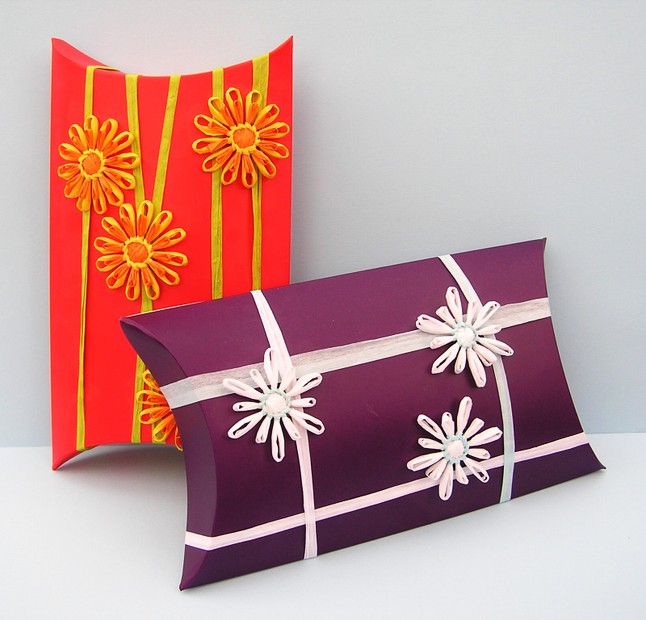 Krabičky ozdobené kytičkami a hvězdičkami z papírového lýka.