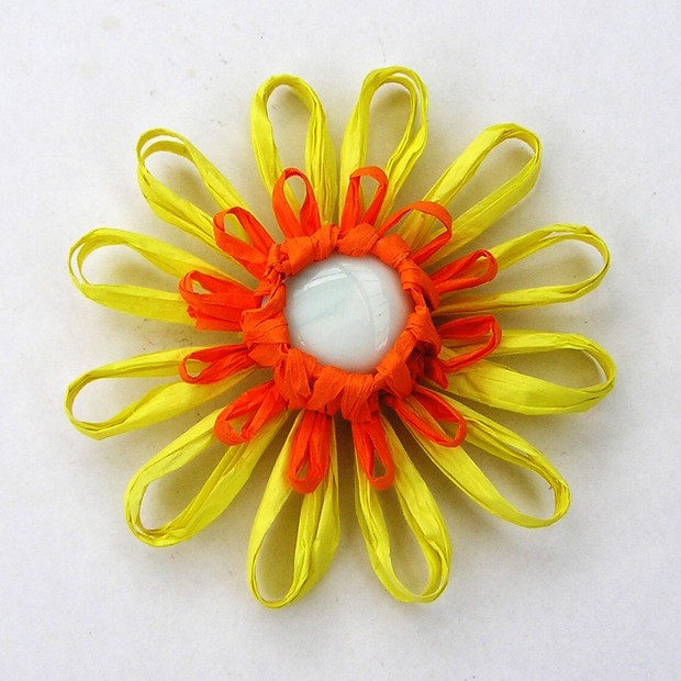 Kytička z papírového lýka se skleněnou čočkou ve středu.