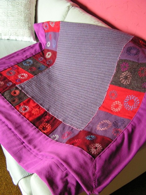 50/50 ušitá deka ze sekáčových svetrů, jedné háčkované přikrývky a nového fleecu...