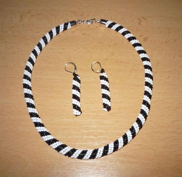 Ručně šitá sada. Délka náhrdelníku je 43 cm, délka náušnic bez háčků je 4 cm.