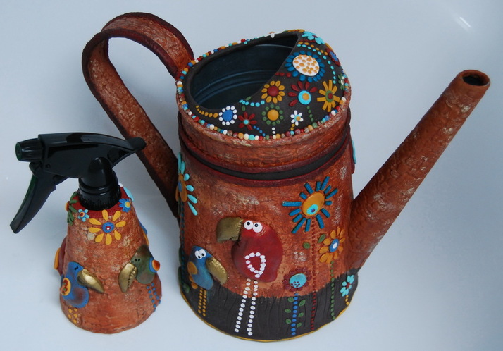 Konvička a rozprašovač vody - plechové - potažené polymerovou hmotou dozdobenou za pomoci textur, stylusů, akrylových barev, pudrů, mikro perliček a kamínků Swarovski.