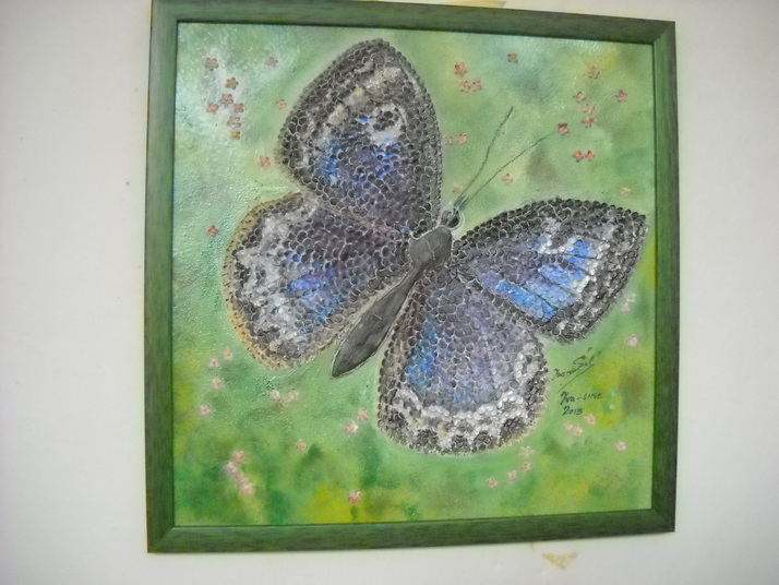 Obraz na skleněné desce, vytvořen klasickou malbou na sklo, starými sklářskými technikami. Motýl má plastické šupiny z vysokého smaltu. Kolorován je sklářskými emailovými barvami.