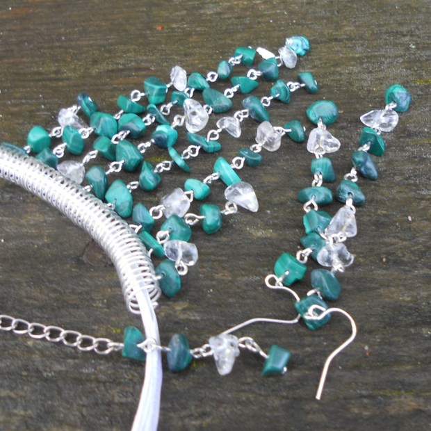 náhrdelník a dlouhé náušnice tvořené ze zlomků malachitu a křišťálu...
