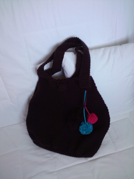Velká prostorná háčkovaná kabelka se dvemi velkými kapsami a malými kapsičkami na mobil atd. A veselými bambulkami, které se dají vystřídat podle nálady