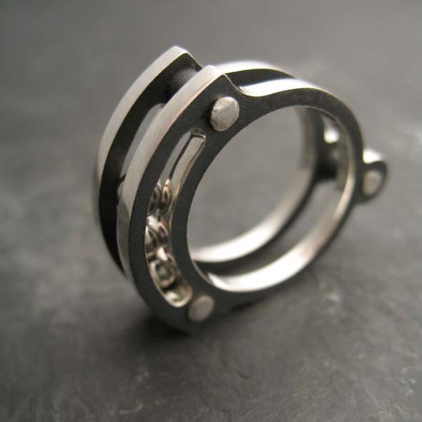 stříbrný prsten s volně se pohybujícími ocelovými kuličkami