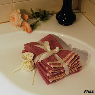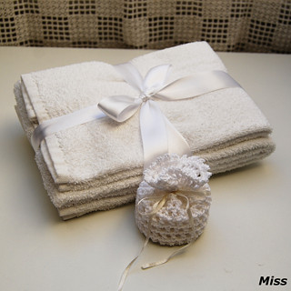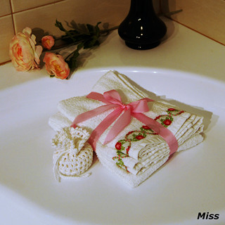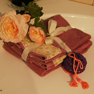 Krásný dárek pro každou ženu. Dva froté ručníky s květinovou portou a krajkou ve vintage stylu a šest kosmetických tampónů v ozdobném sáčku, vše z čisté bavlny.